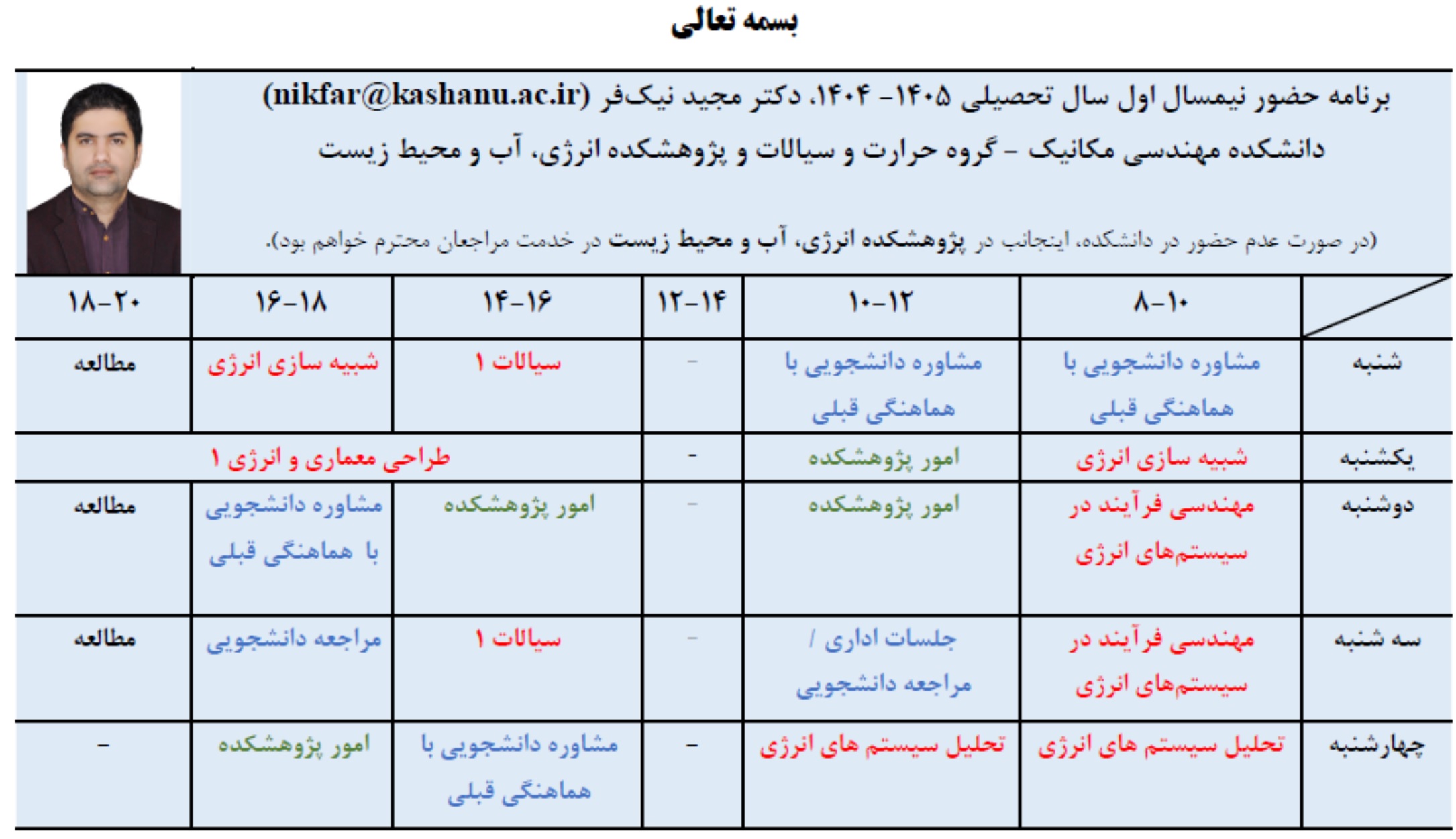 رئیس پژوهشکده انرژی، آب و محیط زیست دانشگاه کاشان- در حال خدمت